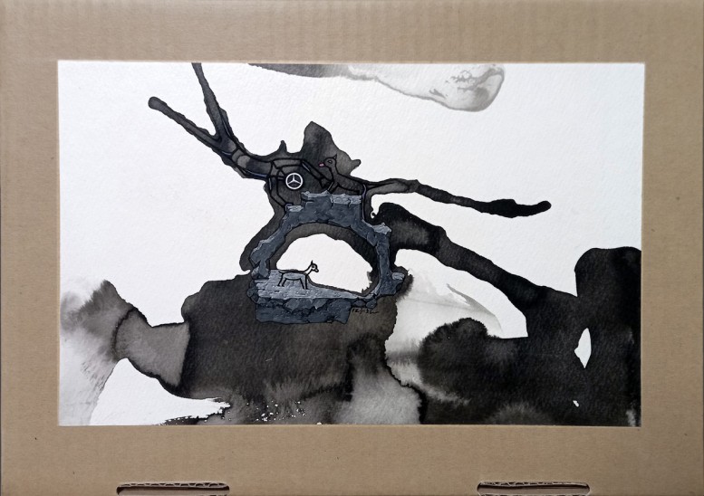 Are human beings currently living well?, 31x21.5cm, Mixed media on Parcel box, 2012