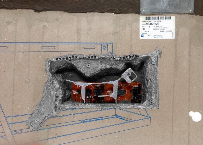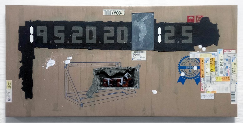 Title : Settle. 105x51x4. 2019. Mixed media on Parcel box