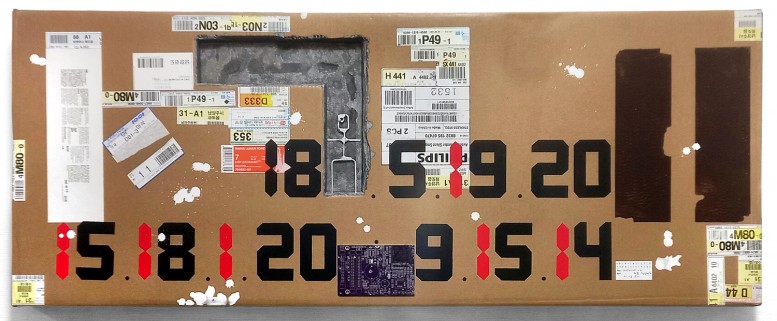 Title : Restoration. 125x48x6. 2021. Mixed media on Parcel box